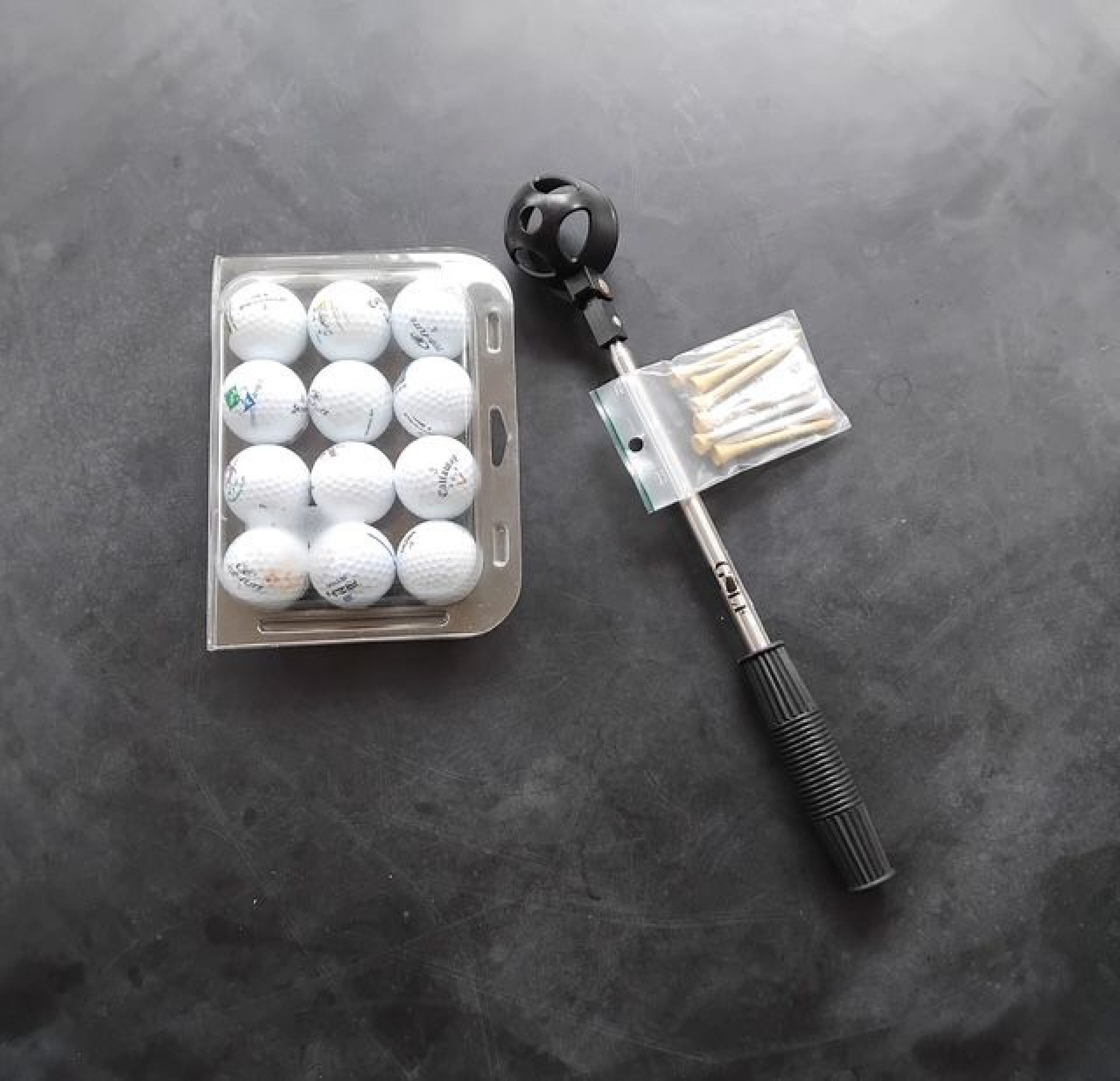 Sont fournis avec le sac 12 balles d’occasion logotees, un sachet de tees et une épuisette télescopique ( toujours utile 😆)